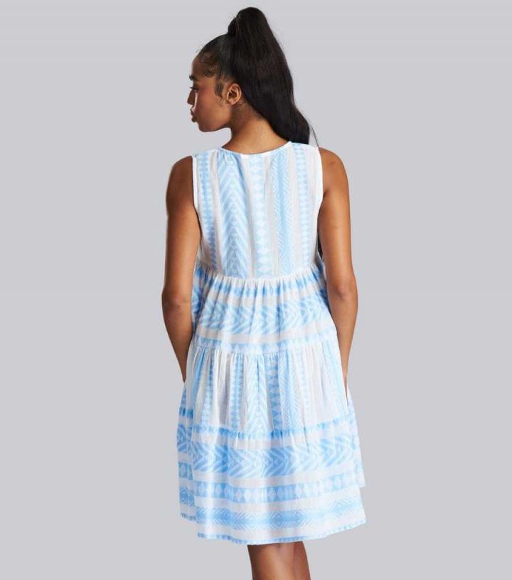 – Jacquard geometric print- V neckline- Sleeveless- Tiered hem- Mini length- Soft cotton fabric- Relaxed fit – Model is 5’8"/173cm and wears UK 10/EU 38/US 6