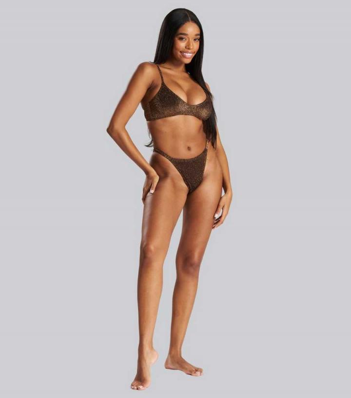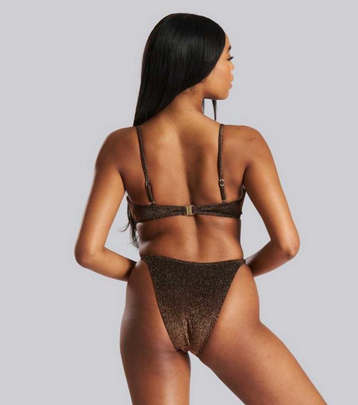 South Beach. A glitter finish makes this brown bikini a sparkly summertime pick. Don’t forget to pack your sunnies! Top:- Online exclusive- Glitter finish- Scoop neckline – Adjustable shoestring straps- Clasp back fastening Bottoms:- Online exclusive- Glit…