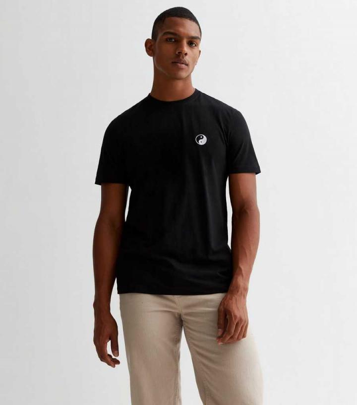Mens Black Cotton Embroidered Yin Yang Logo T-Shirt New Look…
