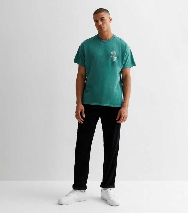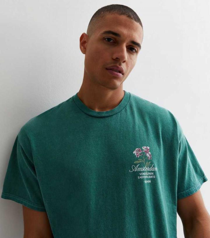 Mens Dark Green Cotton Floral Amsterdam Logo Relaxed Fit T-Shirt New Look…
