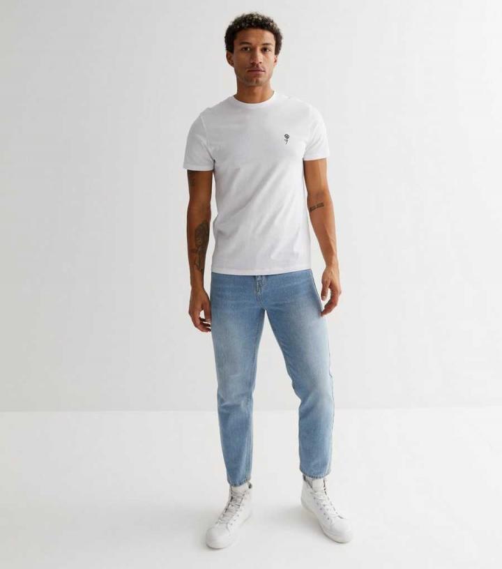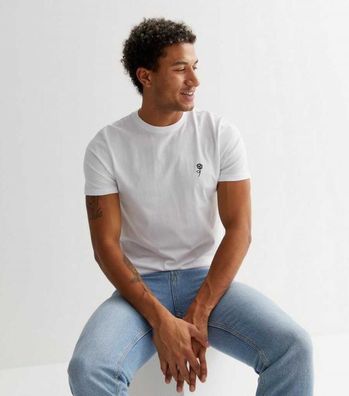Mens White Embroidered Rose Regular Fit T-Shirt New Look…