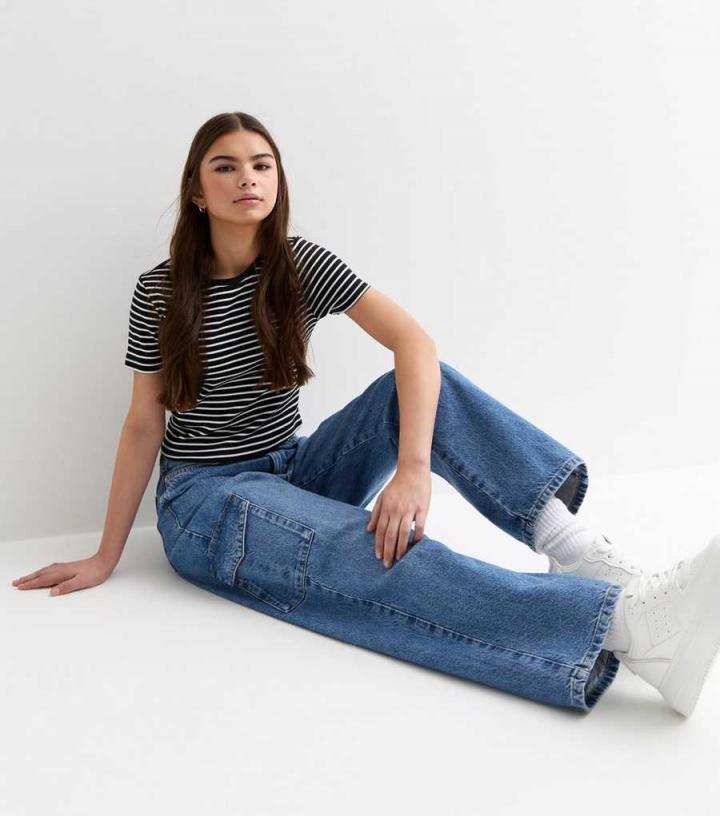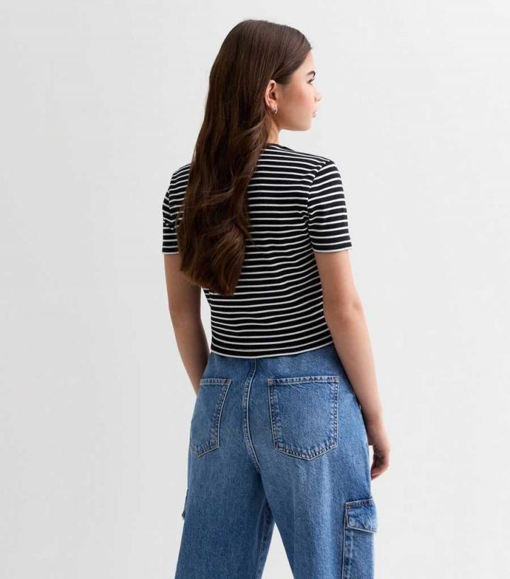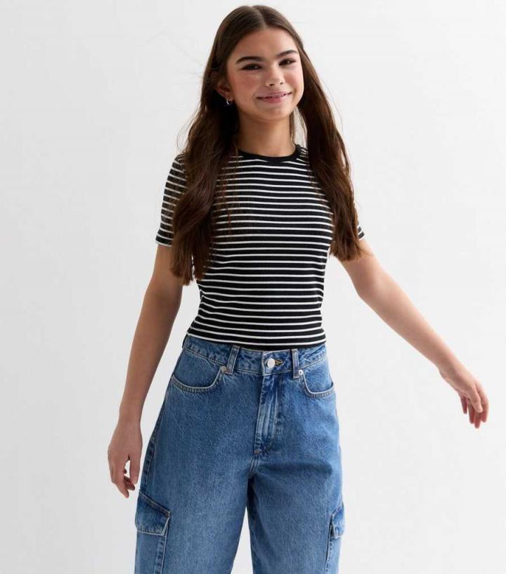 – Black/white- Stripe print- Crew neckline- Short sleeves- Ribbed cotton blend- Slim fit- Model is 5’2"/157cm and wears age 12-13/height 152-158cm