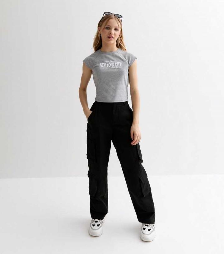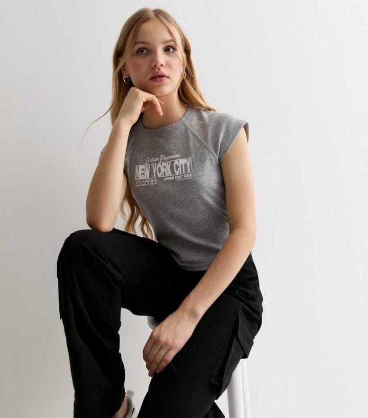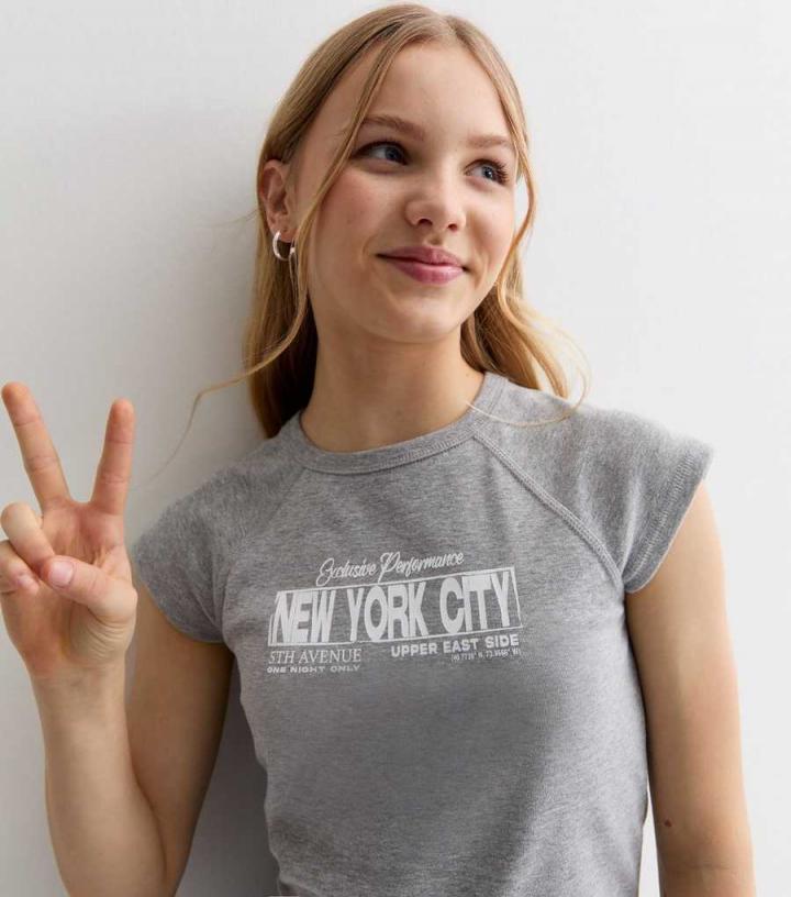 – Grey marl- ‘New York City’ logo- Crew neckline- Short raglan sleeves- Slightly cropped- Cotton blend- Slim fit- Model is 5’2"/157cm and wears age 12-13/height 152-158cm