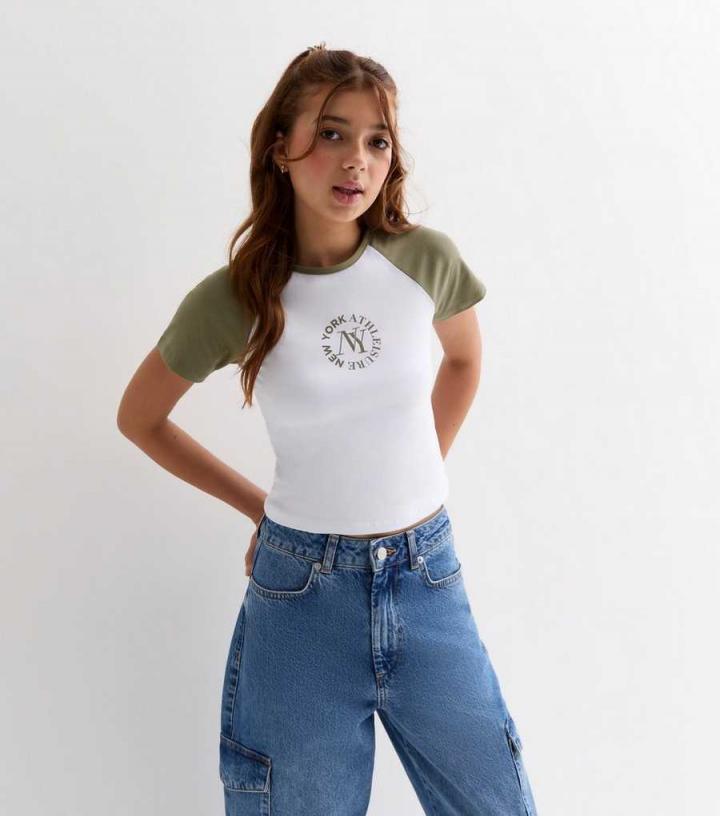 – Olive/white- ‘NY Athletics’ circle logo- Crew neckline- Short raglan sleeves- Slightly cropped hem- Cotton blend- Slim fit- Model is 5’1"/156cm and wears age 12-13/height 152-158cm