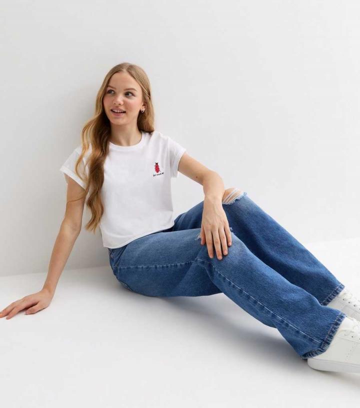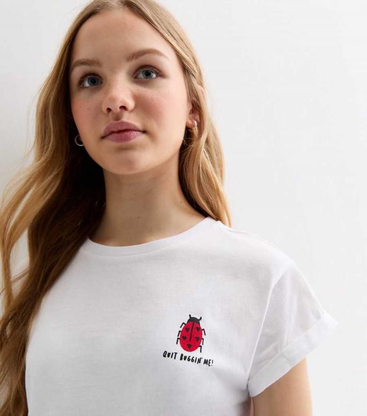 – White- ‘Quit buggin’ me’ ladybird logo- Crew neckline- Short roll sleeves- Slightly cropped hem- Soft cotton fabric- Regular fit- Model is 5’2"/158cm and wears age 12-13/height 152-158cm