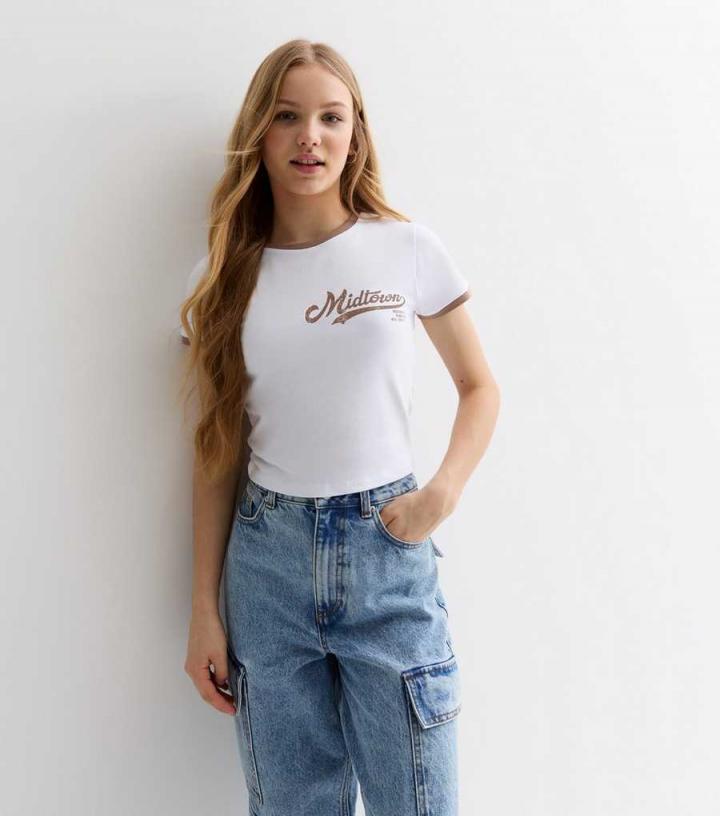 – White/brown- ‘Midtown’ front and back logos- Crew neckline- Short sleeves- Contrasting ringer trim- Cotton blend- Model is 5’2"/157cm and wears age 12-13/height 152-158cm