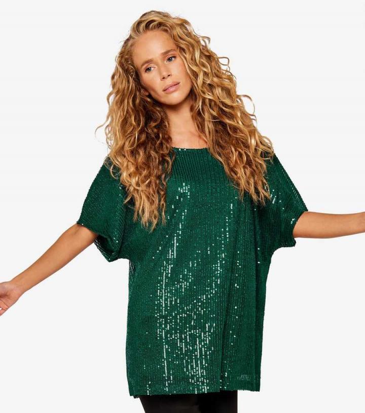 – Crew neckline- 1/2 sleeves- Sequin fabric- Relaxed fit- Model is 5’8"/173cm and wears UK 10/EU 38/US 6