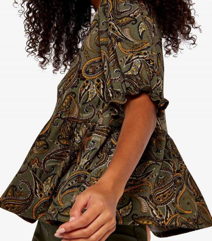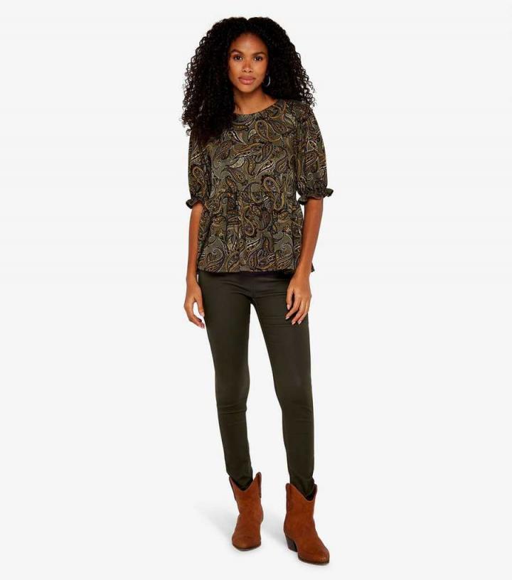 Apricot. Decorated with a pretty paisley print, this olive top will shake up your everyday collection. Pair with jeans on casual days, then lift for evening occasions with leather-look leggings.