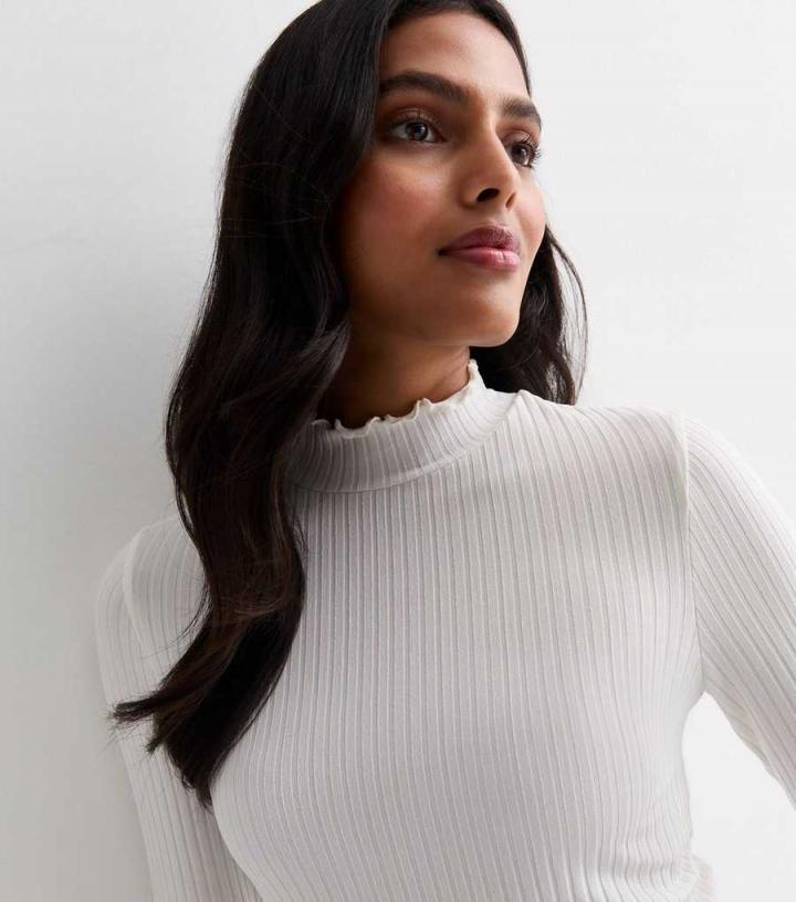 – Off white- Stand neckline- Long sleeves- Frill cuffs and hems- Ribbed jersey fabric- Slim fit- Model is 5’7"/171cm and wears UK 10/EU 38/US 6