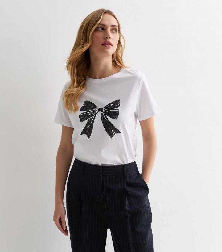 Tops | New Look Womens White Cotton Bow Logo T-Shirt