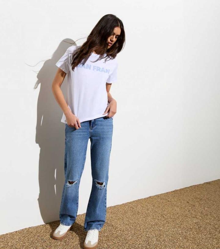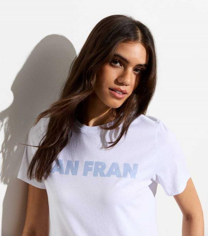 – White/blue- ‘San Fran’ logo- Crew neckline- Short sleeves- Cotton fabric- Model is 5’9"/175cm and wears UK 10/EU 38/US 6