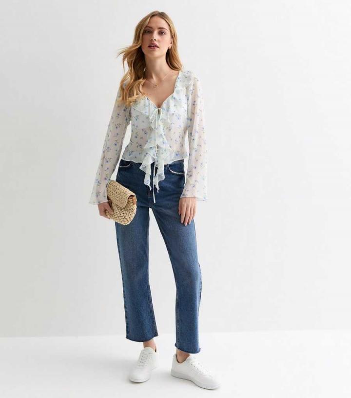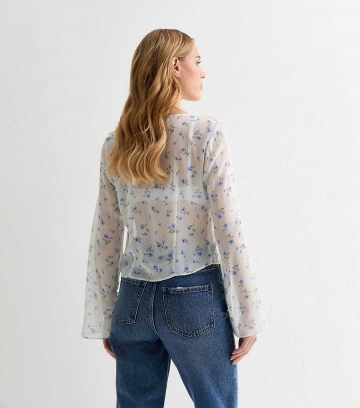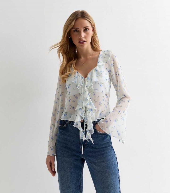 – White/blue- Floral print- V neckline- Long sleeves- Ruffle trim- Tie front fastening- Sheer fabric- Regular fit- Model is 5’8"/173cm and wears UK 10/EU 38/US 6