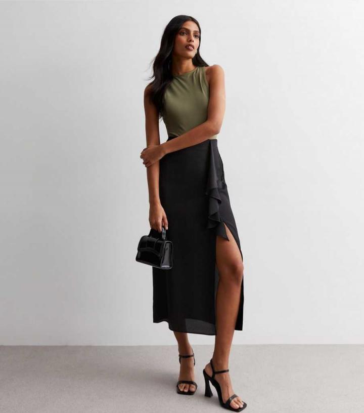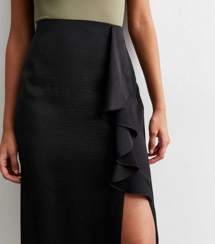 – High waist- Side ruffle detail- Split hem- Midi length- Soft satin fabric- Regular fit- Model is 5’8"/173cm and wears UK 10/EU 38/US 6