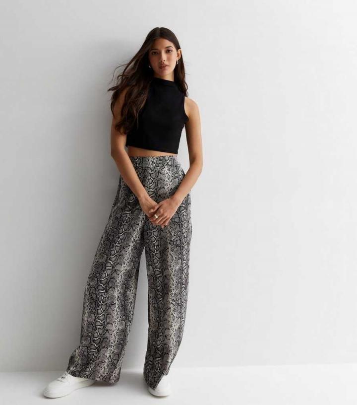 – Snake print- High waist- Wide leg- Soft satin fabric- Regular fit- Model is 5’8"/173cm and wears UK 10/EU 38/US 6