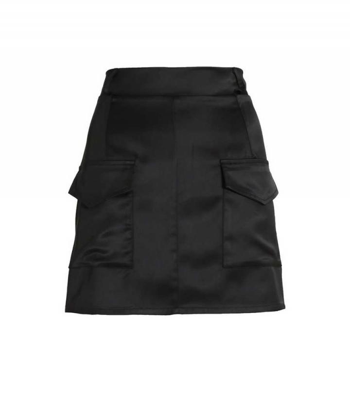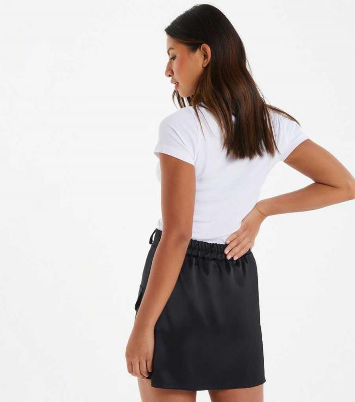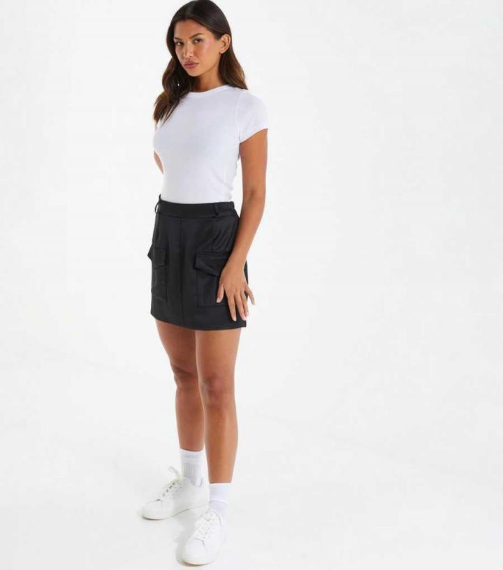 QUIZ. Crafted from a satin fabric, add a sleek pick to your wardrobe with this black mini skirt. Cargo pockets provided added wearability, ridding the need for a bag on your next night out.