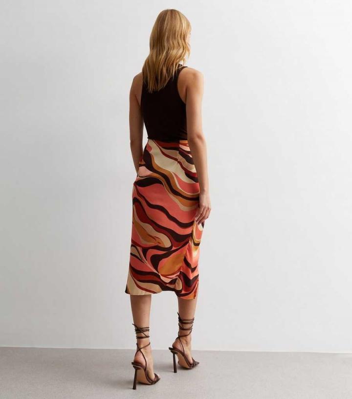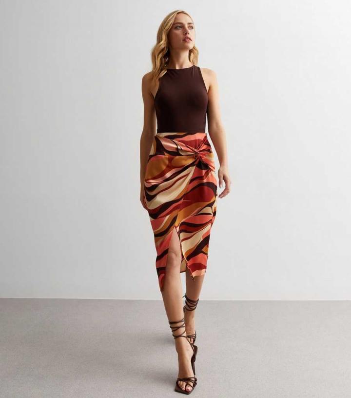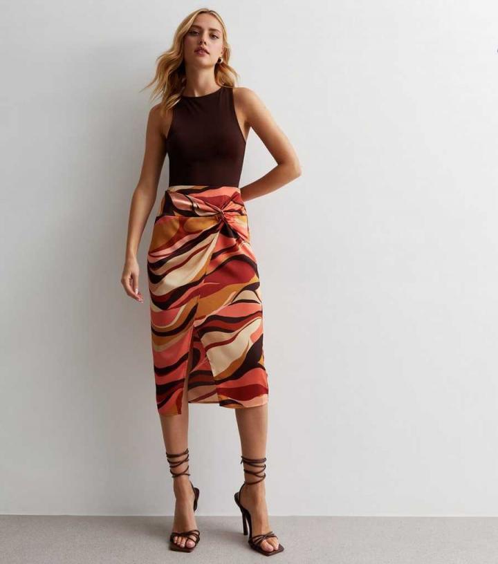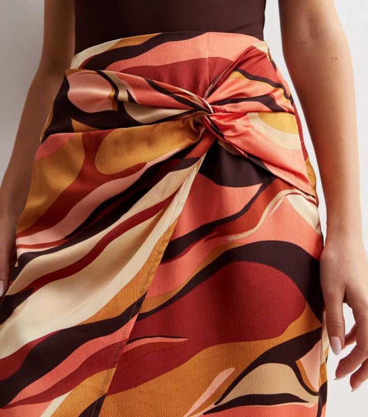 Urban Bliss. Add a pop of colour to your going out wardrobe with this satin midi skirt, designed with an abstract print and knot front. We love it styled with a halter neck top and stilettos.