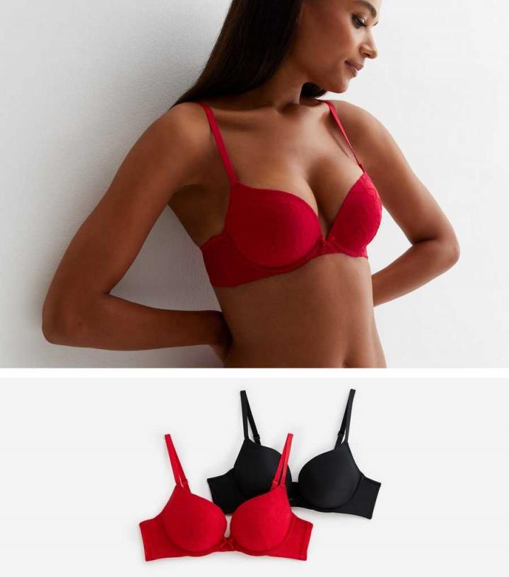Lingerie | New Look Womens 2 Pack Black and Red Flocked Heart Print Push Up Bras