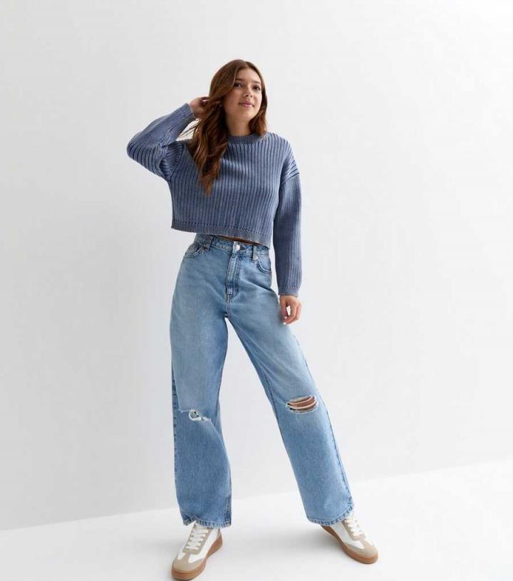 Jeans | New Look Girls Blue High Waist Ripped Wide Leg Jeans