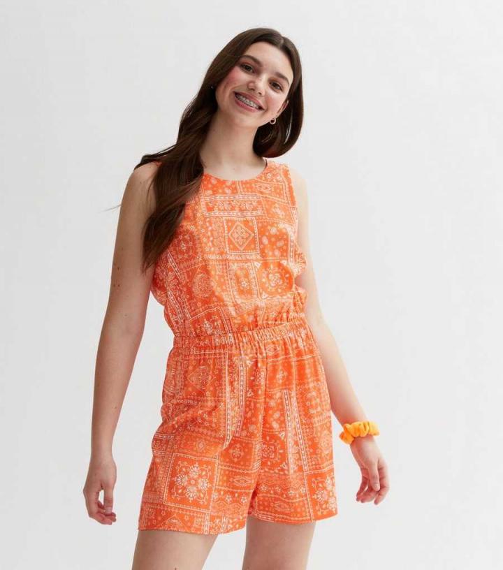 Swimwear | New Look Girls Orange Tile Print Twist Back Playsuit