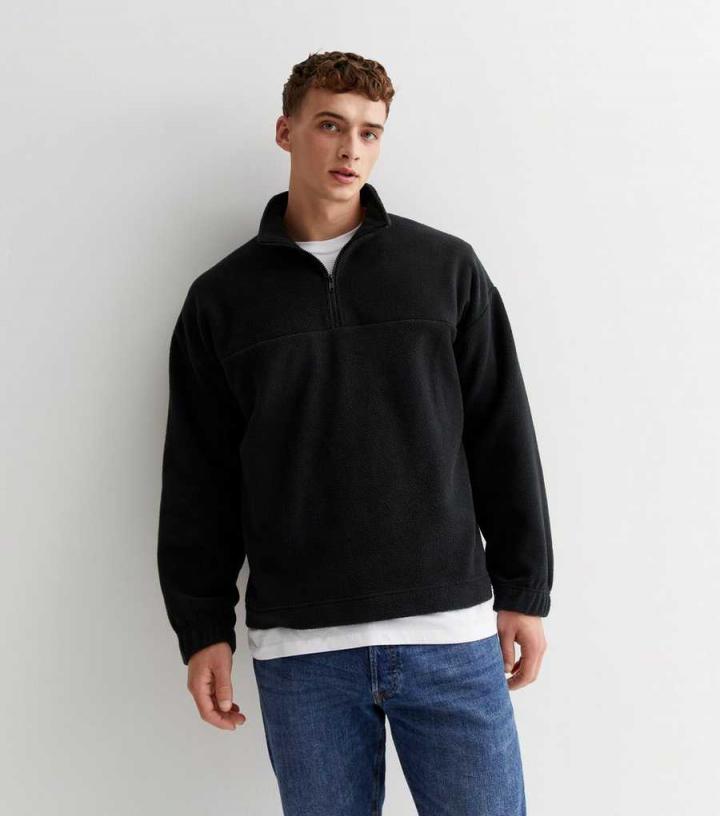 Hoodies & Sweats | New Look Mens Black Fleece Zip Neck Oversized Sweatshirt