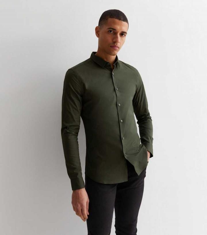 Muscle Fit | New Look Mens Khaki Poplin Long Sleeve Muscle Fit Shirt
