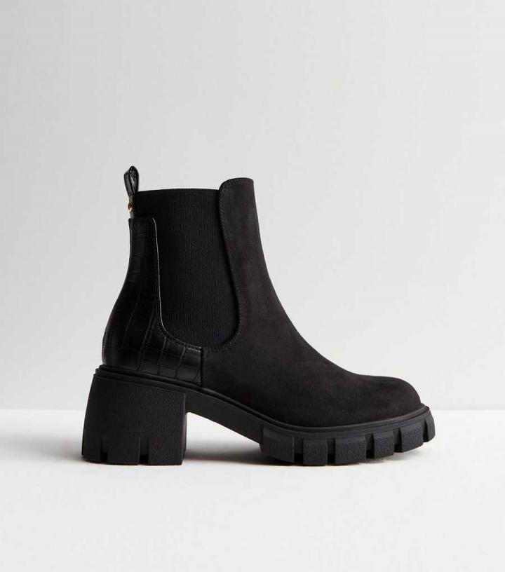 Boots | New Look Womens|Girls Black Suedette Faux Croc Chunky Block Heel Chelsea Boots