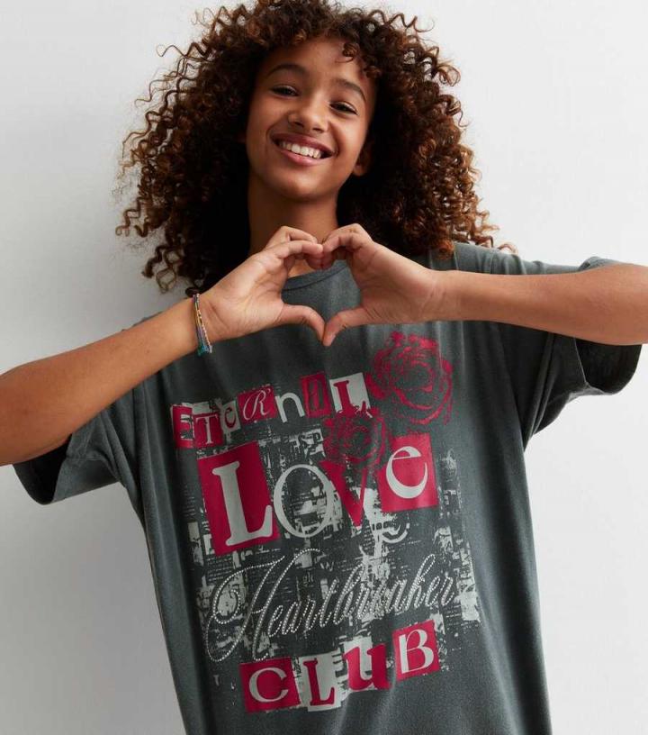 Tops | New Look Girls Dark Grey Cotton Heartbreaker Logo Long Oversized T-Shirt
