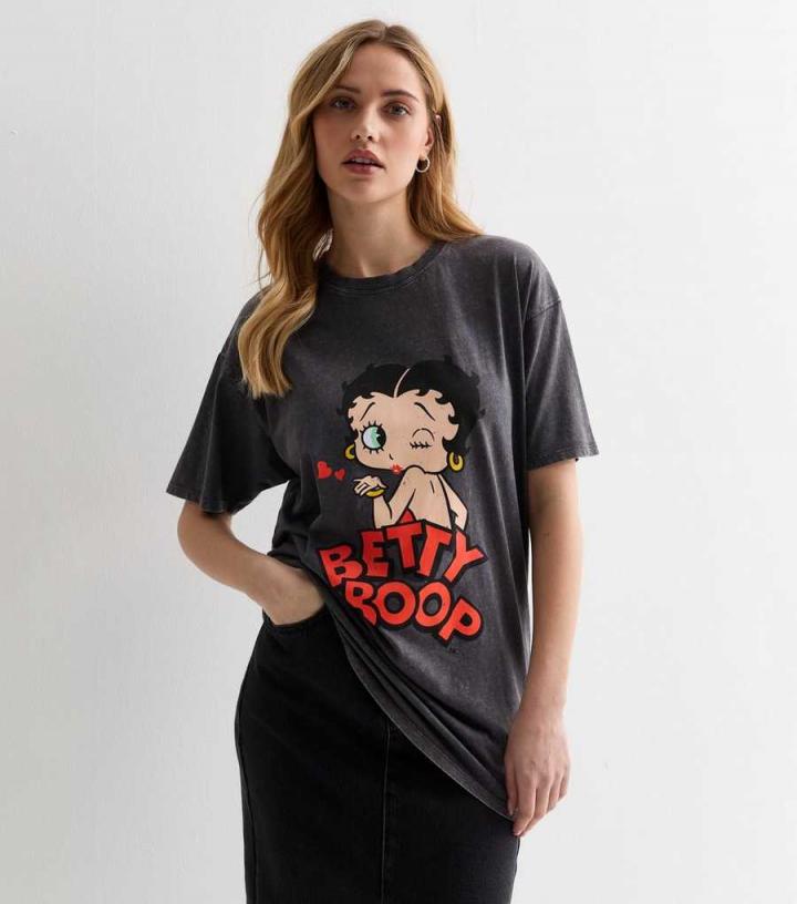Lounge & Sports | New Look Womens Dark Grey Acid Wash Betty Boop Logo Oversized T-Shirt