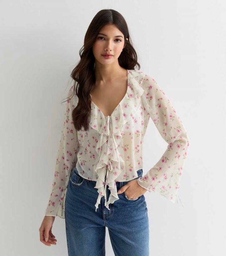 Shirts & Blouses | New Look Womens White Floral Sheer Ruffle Tie Front Blouse