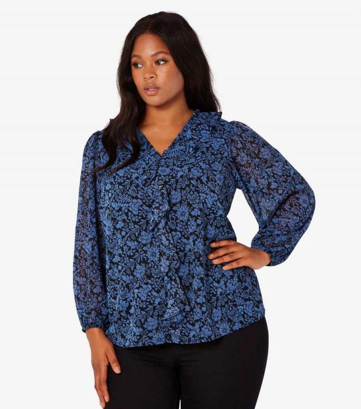 Tops | New Look Womens Apricot Curves Blue Floral Ruffle V Neck Top
