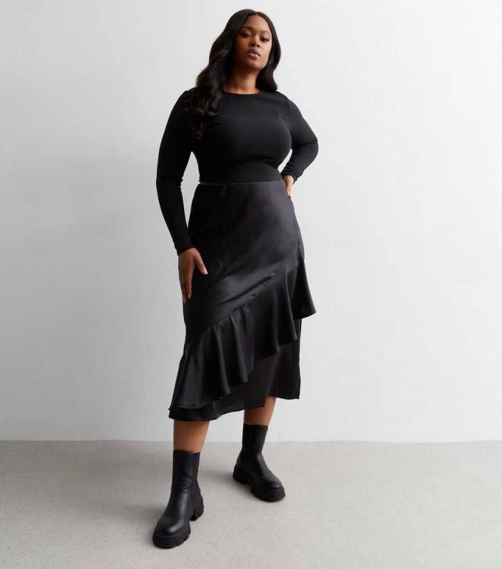 Trousers, Skirts & Shorts | New Look Womens Curves Black Satin Ruffle Midi Skirt